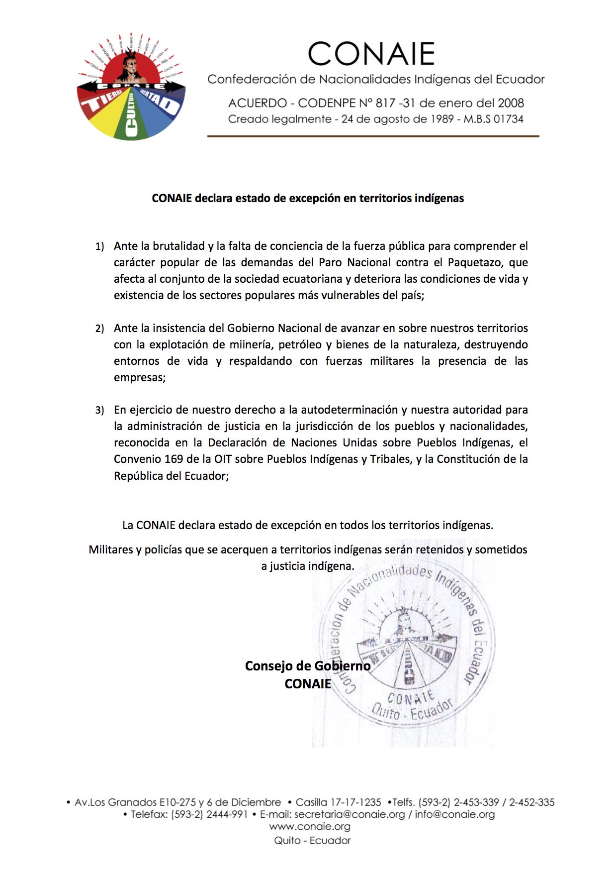 Following the protests, President Moreno announced an “estado de excepción”, which is essentially a national emergency, and reaffirmed that there “is no possibility of [reinstalling the] perverse subsidy that was causing damage to the country”. The Confederation of Indigenous Nationalities of Ecuador, or CONAIE, fired back at the President by announcing their own “estado de exepcion en todos los territorios indigenas” where “military and police who are… in indigenous territories will be held and subjected to indigenous justice.” A CONAIE-led group then marched onto the captial city of Quito, to which President Moreno declared he “had temporarily moved government operations to the” city of Guayaquil.